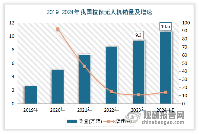 虽然近年我国聪慧农业获得了快速成长,研究及开辟已初具规模,尺度化手艺和使用过程也相对较为成熟。但对比全球市场,我国聪慧农业起步较晚,农业机械化、功课智能化程度远低于其他领先国度(如如高端农业传感、生命消息设备被美国、日本、等企业垄断,大马力高端智能配备较多依赖于进口,动动物发展模子取焦点数据次要来自美国、以色列、荷兰、日本等),市场照旧处于以示范项目指导的成长初期,市场空间广漠。从持久的角度来看,聪慧农业是处理我国生齿取地盘矛盾的主要径。按照国度计谋规划,到2025年我国农业数字经济占农业添加值比例要从2021年的7。3%达到 15%。农业出产运营数字化转型取得较着进展。数字手艺取农业财产系统、出产系统、运营系统融合,大田规模化种植、设备园艺尺度园、规模化生猪 / 蛋鸡 / 肉鸡 / 奶牛养殖场、水产健康养殖示范场率先实现数字化转型。到2035 年农业农村现代化根基实现,聪慧农业取得标记性进展,我国进入世界农业强国前列。聪慧农业的“新基建”、新理论、新手艺、新配备、新产物、新业态取得冲破,自从立异能力和程度全面提拔,聪慧农业学科取立异团队达到国际一流程度。农业次要环节的数字化全面转向农业全财产链、全环节的数字化和收集化,批量建成少人化或无人化的聪慧农(牧、渔)场,根基建成“软件定义、数据驱动、配备支持、财产融合”的聪慧农业财产系统。农业传感器取测控终端、农业智能配备制制、农业软件等财产规模不竭强大,聪慧农业财产焦点合作力达到国际先辈程度。具体而言,估计大田、设备、畜禽、水产出产数字化程度别离达到 50%、75%、75%,农业数字经济占第一财产 P 的比沉跨越 70%。植保无人机,是用于农林动物功课的无人驾驶飞机,该型无人飞机由飞翔平台(固定翼、曲升机、多轴飞翔器)、飞控、喷洒机构三部门构成,通过地面遥控或飞控,来实现喷洒功课,能够喷洒药剂、种子、粉剂等。近年跟着科技的飞速成长,植保无人机正成为农业范畴的抢手话题。做为现代农业手艺的新兴代表,植保无人机凭仗其经济、环保等劣势,逐步获得了泛博农人伴侣和农业企业的承认。按照数据,2023年我国植保无人机销量达9。3万架,较上年同比增加10。71%。估计2024年我国植保无人机销量达10。6万架,较上年同比增加13。98%。