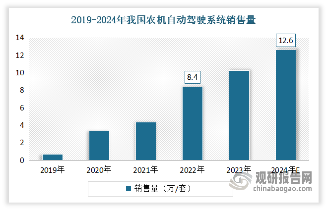 农机从动驾驶系统是聪慧农业的主要构成部门,是一种操纵高精度卫星定位消息,连系传感器和算法,实现农业机械从动化驾驶的系统,次要由车载从动驾驶系统组件和挪动基准坐组件两部门构成。正在聪慧农业时代,农机配备的高度智能化成为显著特征,而农机从动驾驶系统则是智能化农机配备不成或缺的焦点组件。近几年跟着农业机械化成长很快,我国农机从动化系统初见成效,总体上曾经进入了高速增加期间。数据显示,2022年我国农机从动驾驶系统发卖量达8。4万/套,同比增加92。22%。估计2024年我国农机从动驾驶系统发卖量将跨越12万/套。