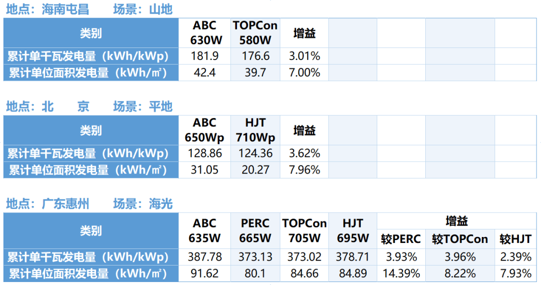 同时,通过PVsyst模仿测试软件对分歧纬度的地址进行测试,成果表白,ABC组件单千瓦发电量亦领先于TOPCon。